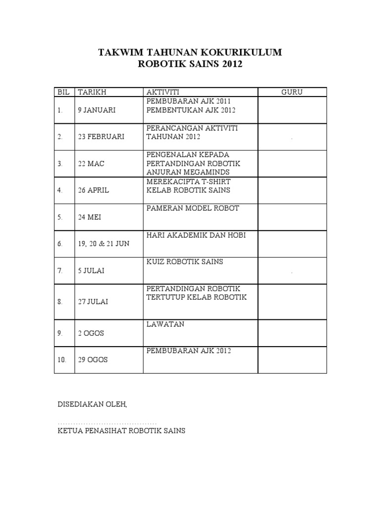 Takwim Tahunan Kokurikulum Robotik 2012 Pdf