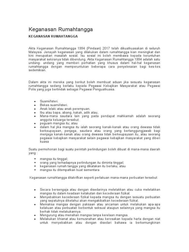 Akta keganasan rumah tangga 1994 Diterbitkan oleh JD001109pnmb kl. Akta Keganasan Rumahtangga 1994 Pindaan 2017 telah dikuatkuasakan di seluruh Malaysia. Mdc Legal Advisers Pages.