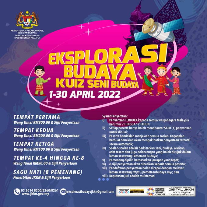 Alhamdulillah bersyukur ke hadrat Ilahi dengan limpah inayah dan keizinan-Nya Jabatan Kebudayaan dan Kesenian Negara. Seminar bengkel ceramah dan kursus. Tingkat 14-15 Menara DBKL 3 Bandar Wawasan Jalan Raja Abdullah 50300 Kuala Lumpur.